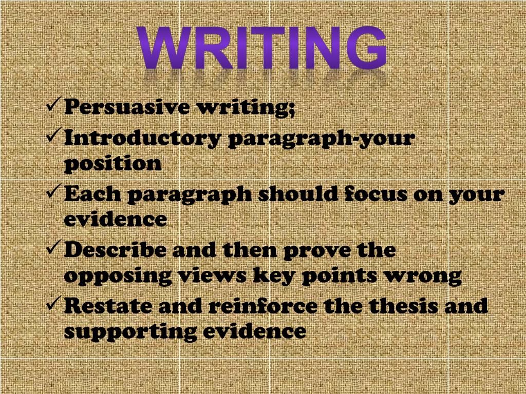 Writing • Persuasive writing; • Introductory paragraph-your position • Each paragraph should focus on your evidence • Describe and then prove the opposing views key points wrong • Restate and reinforce the thesis and supporting evidence