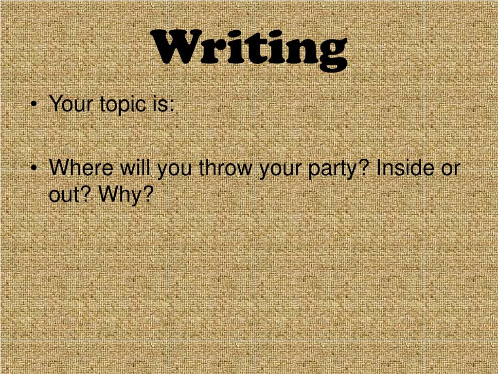 Writing • Your topic is: • Where will you throw your party? Inside or out? Why?
