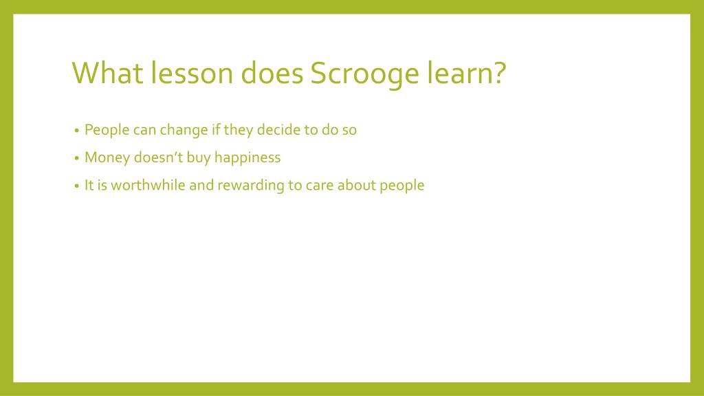 What lesson does Scrooge learn? • People can change if they decide to do so • Money doesn’t buy happiness • It is worthwhile and rewarding to care about people