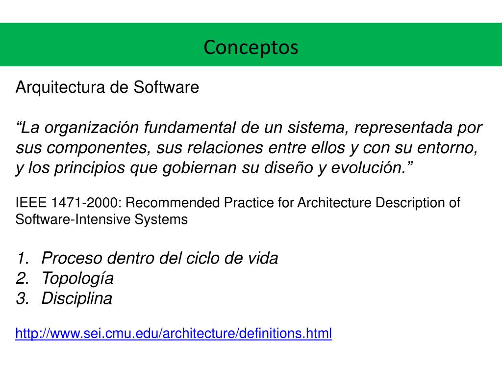 Conceptos • Arquitectura de Software • “La organización fundamental de un sistema, representada por sus componentes, sus relaciones entre ellos y con su entorno, y los principios que gobiernan su diseño y evolución.” • IEEE 1471-2000: Recommended Practice for Architecture Description of Software-Intensive Systems • Proceso dentro del ciclo de vida • Topología • Disciplina • http://www.sei.cmu.edu/architecture/definitions.html