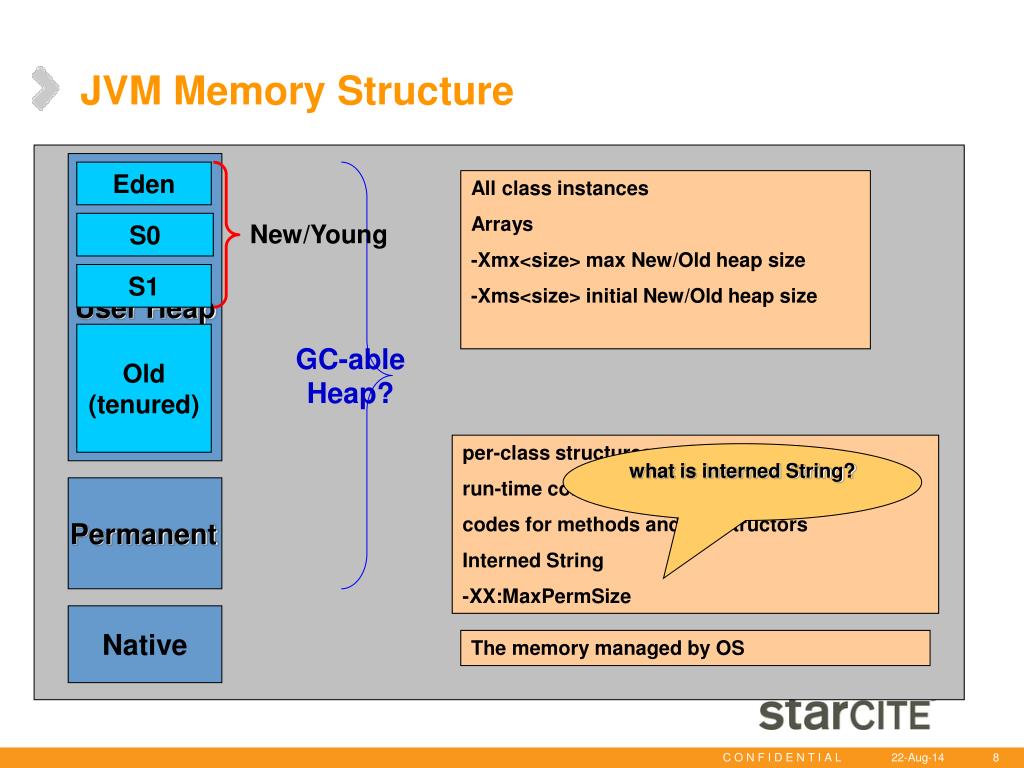 New/Young JVM Memory Structure User Heap Eden GC-able Heap? All class instances Arrays -Xmx<size> max New/Old heap size -Xms<size> initial New/Old heap size S0 S1 Old (tenured) per-class structures: run-time constant pool, field and method data codes for methods and constructors Interned String -XX:MaxPermSize what is interned String? Permanent Native The memory managed by OS