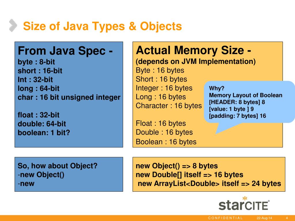 Size of Java Types & Objects From Java Spec - byte : 8-bit short : 16-bit Int : 32-bit long : 64-bit char : 16 bit unsigned integer float : 32-bit double: 64-bit boolean: 1 bit? Actual Memory Size - (depends on JVM Implementation) Byte : 16 bytes Short : 16 bytes Integer : 16 bytes Long : 16 bytes Character : 16 bytes Float : 16 bytes Double : 16 bytes Boolean : 16 bytes Why? Memory Layout of Boolean [HEADER: 8 bytes] 8 [value: 1 byte ] 9[padding: 7 bytes] 16 • So, how about Object? • new Object() • new new Object() => 8 bytes new Double[] itself => 16 bytes new ArrayList<Double> itself => 24 bytes