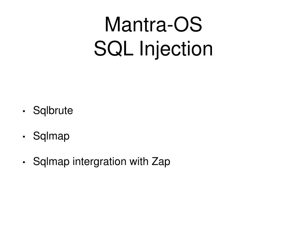 Mantra-OSSQL Injection • Sqlbrute • Sqlmap • Sqlmap intergration with Zap
