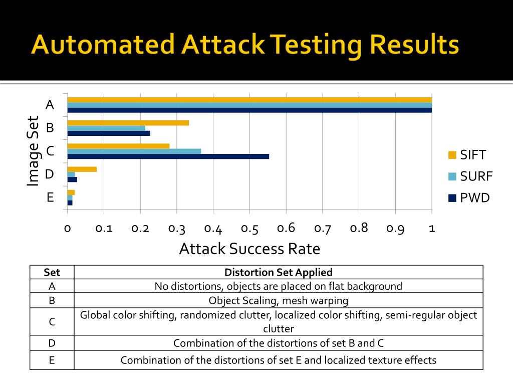 Automated Attack Testing • Three likely object recognition techniques tested • One based on matching of pixel color values • Object template matching via measuring the normalized pixel-wise difference (PWD) • Two advanced methods that look for correlation between object images and the scene image with regards to various types of distinctive image locations • Scale Invariant Feature Transform (SIFT) • Speeded Up Robust Features (SURF)