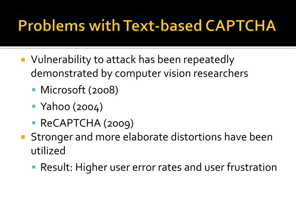 Problems with Text-based CAPTCHA • Vulnerability to attack has been repeatedly demonstrated by computer vision researchers • Microsoft (2008) • Yahoo (2004) • ReCAPTCHA (2009) • Stronger and more elaborate distortions have been utilized • Result: Higher user error rates and user frustration