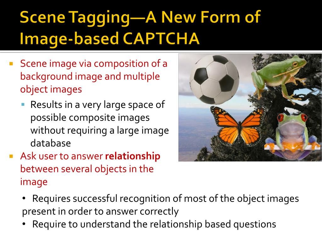 Scene Tagging―A New Form of Image-based CAPTCHA • Scene image via composition of a background image and multiple object images • Results in a very large space of possible composite images without requiring a large image database • Ask user to answer relationship between several objects in the image • Requires successful recognition of most of the object images present in order to answer correctly • Require to understand the relationship based questions