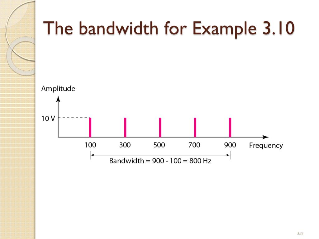 Example 3.10 • If a periodic signal is decomposed into five sine waves with frequencies of 100, 300, 500, 700, and 900 Hz, what is its bandwidth? Draw the spectrum, assuming all components have a maximum amplitude of 10 V. • Solution • Let fh be the highest frequency, fl the lowest frequency, and B the bandwidth. Then • The spectrum has only five spikes, at 100, 300, 500, 700, and 900 Hz (see Figure 3.13).