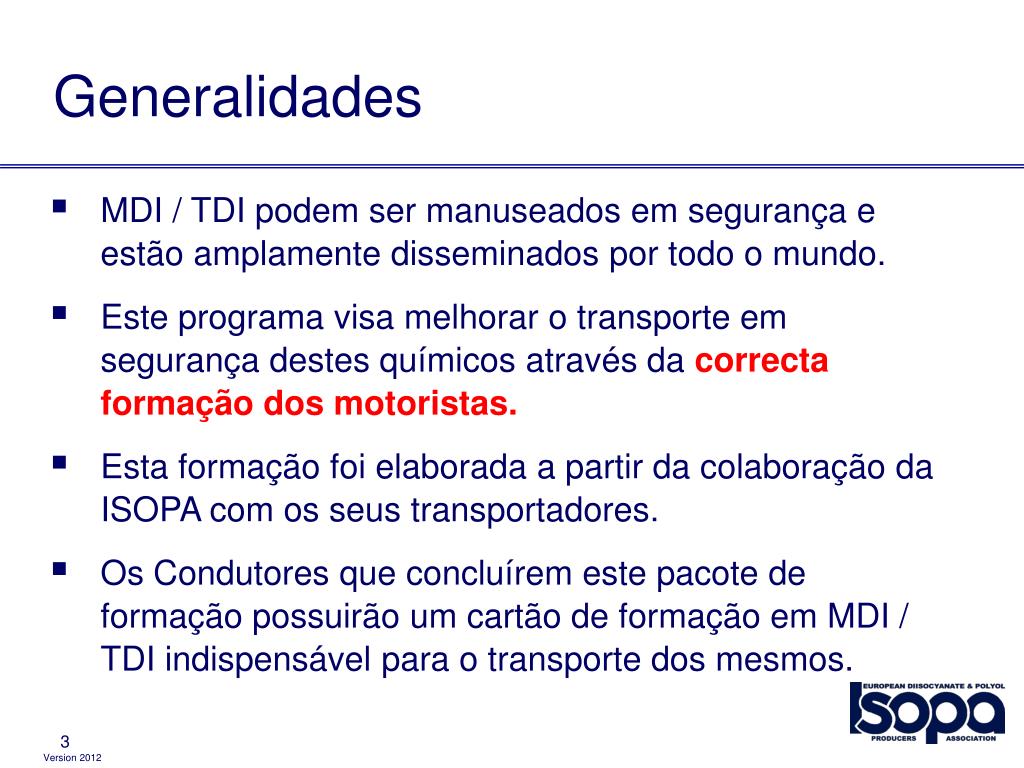 Generalidades • MDI / TDI podem ser manuseados em segurança e estão amplamente disseminados por todo o mundo. • Este programa visa melhorar o transporte em segurança destes químicos através da correcta formação dos motoristas. • Esta formação foi elaborada a partir da colaboração da ISOPA com os seus transportadores. • Os Condutores que concluírem este pacote de formação possuirão um cartão de formação em MDI / TDI indispensável para o transporte dos mesmos.