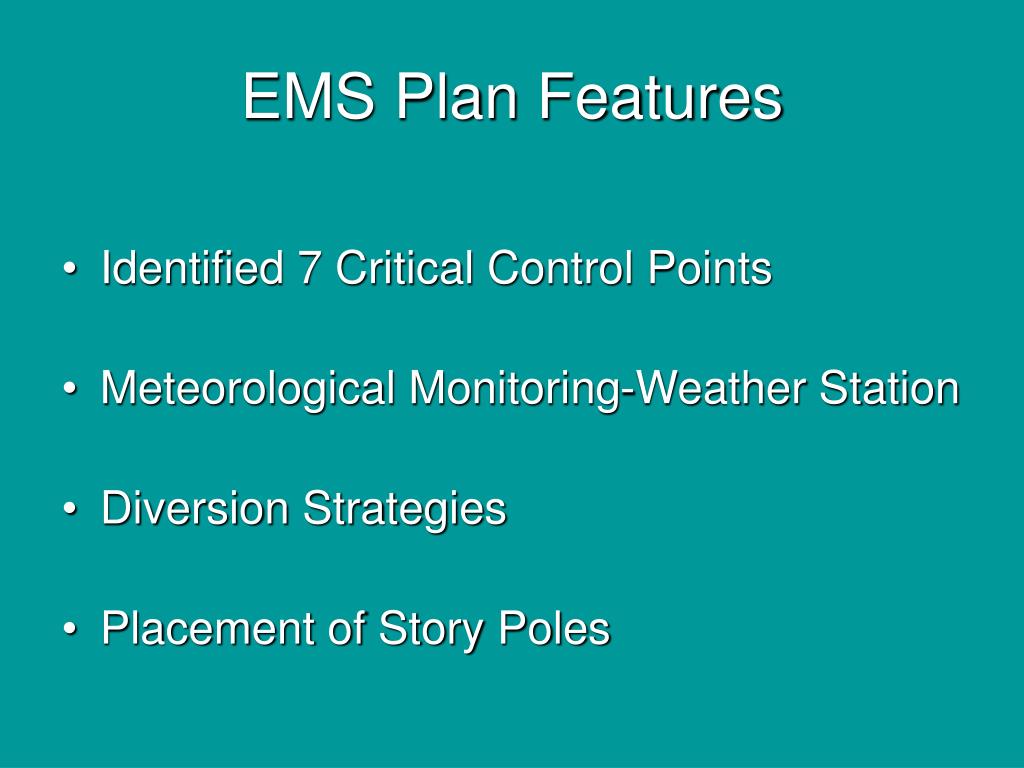 EMS Plan Features • Identified 7 Critical Control Points • Meteorological Monitoring-Weather Station • Diversion Strategies • Placement of Story Poles