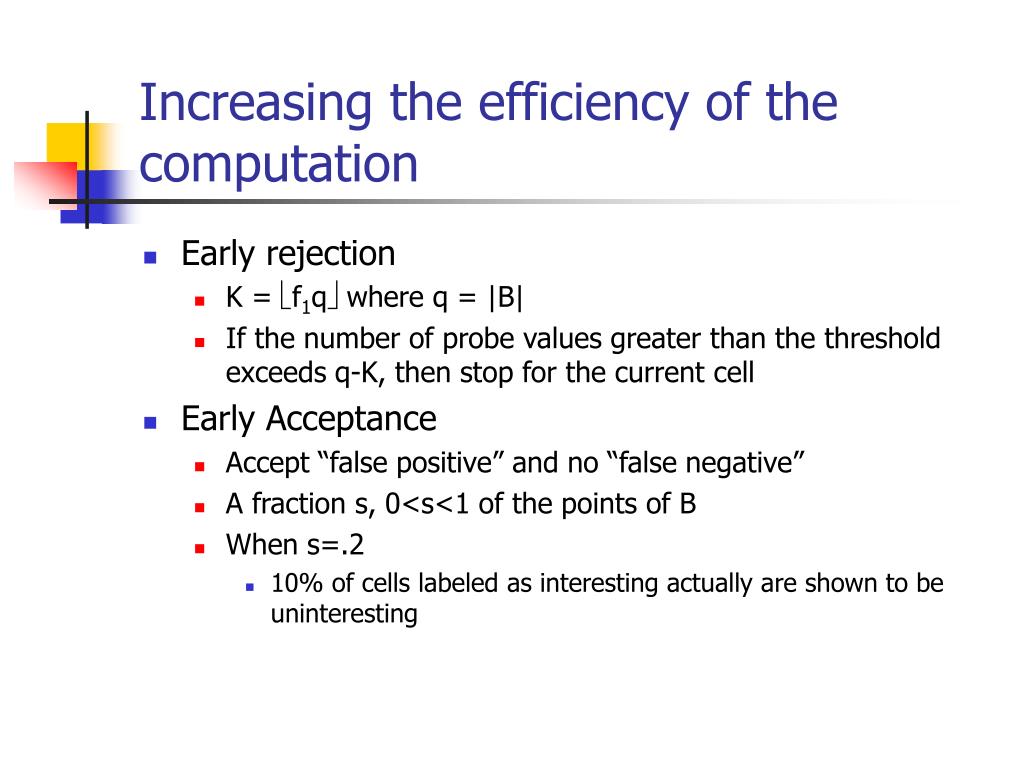 Increasing the efficiency of the computation • Early rejection • K = f1q where q = |B| • If the number of probe values greater than the threshold exceeds q-K, then stop for the current cell • Early Acceptance • Accept “false positive” and no “false negative” • A fraction s, 0<s<1 of the points of B • When s=.2 • 10% of cells labeled as interesting actually are shown to be uninteresting