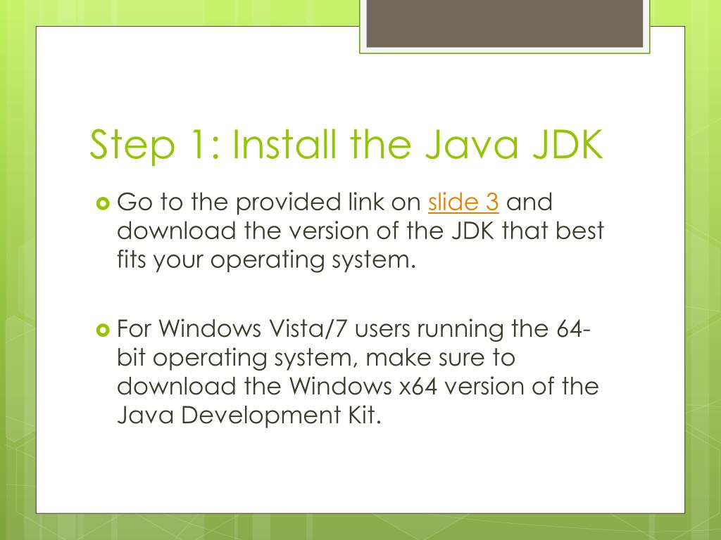 Step 1: Install the Java JDK • Go to the provided link on slide 3 and download the version of the JDK that best fits your operating system. • For Windows Vista/7 users running the 64-bit operating system, make sure to download the Windows x64 version of the Java Development Kit.