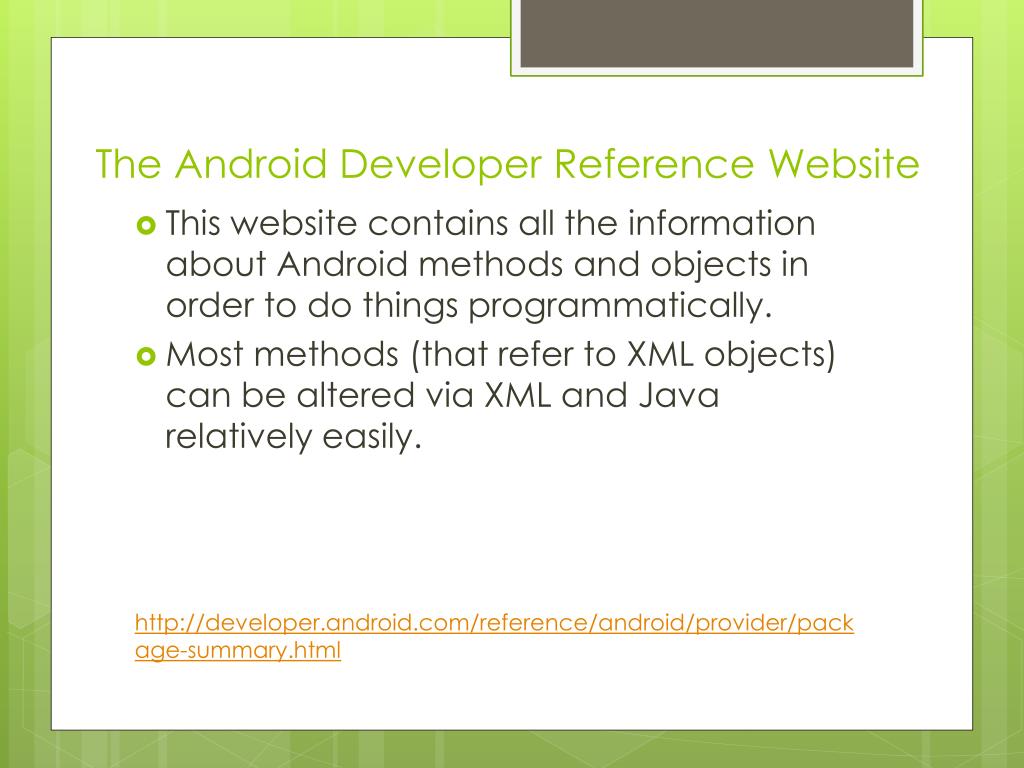 The Android Developer Reference Website • This website contains all the information about Android methods and objects in order to do things programmatically. • Most methods (that refer to XML objects) can be altered via XML and Java relatively easily. http://developer.android.com/reference/android/provider/package-summary.html