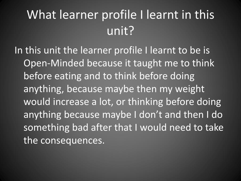What learner profile I learnt in this unit? In this unit the learner profile I learnt to be is Open-Minded because it taught me to think before eating and to think before doing anything, because maybe then my weight would increase a lot, or thinking before doing anything because maybe I don’t and then I do something bad after that I would need to take the consequences.