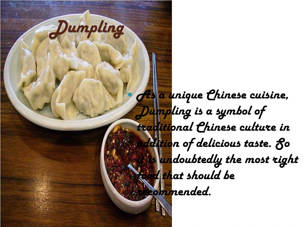 Dumpling • As a unique Chinese cuisine, Dumpling is a symbol of traditional Chinese culture in addition of delicious taste. So it is undoubtedly the most right food that should be recommended.