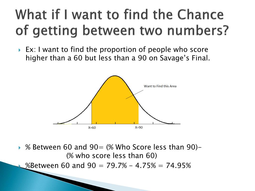 What if I want to find the Chance of getting between two numbers? Ex: I want to find the proportion of people who score higher than a 60 but less than a 90 on Savage’s Final. % Between 60 and 90= (% Who Score less than 90)- (% who score less than 60) %Between 60 and 90 = 79.7% - 4.75% = 74.95%