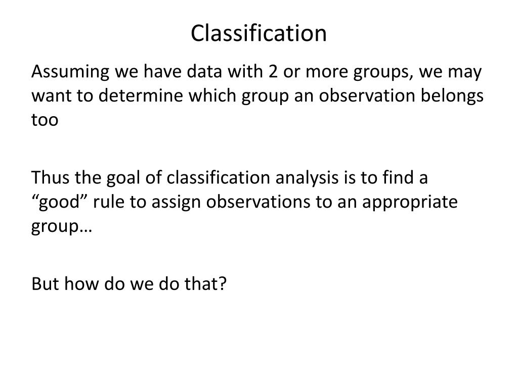 Classification Assuming we have data with 2 or more groups, we may want to determine which group an observation belongs too Thus the goal of classification analysis is to find a “good” rule to assign observations to an appropriate group… But how do we do that?