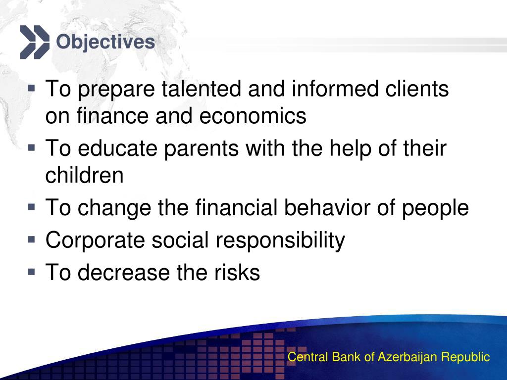Objectives Central Bank of Azerbaijan Republic To prepare talented and informed clients on finance and economics To educate parents with the help of their children To change the financial behavior of people Corporate social responsibility To decrease the risks