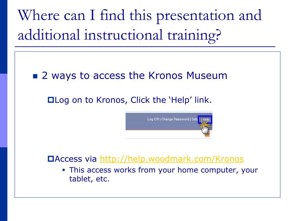 Where can I find this presentation and additional instructional training? • 2 ways to access the Kronos Museum • Log on to Kronos, Click the ‘Help’ link. • Access via http://help.woodmark.com/Kronos • This access works from your home computer, your tablet, etc.