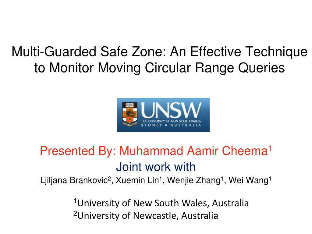 Multi-Guarded Safe Zone: An Effective Technique to Monitor Moving Circular Range Queries. Presented By: Muhammad Aamir Cheema 1 Joint work with Ljiljana Brankovic 2 , Xuemin Lin 1 , Wenjie Zhang 1 , Wei Wang 1. 1 University of New South Wales, Australia