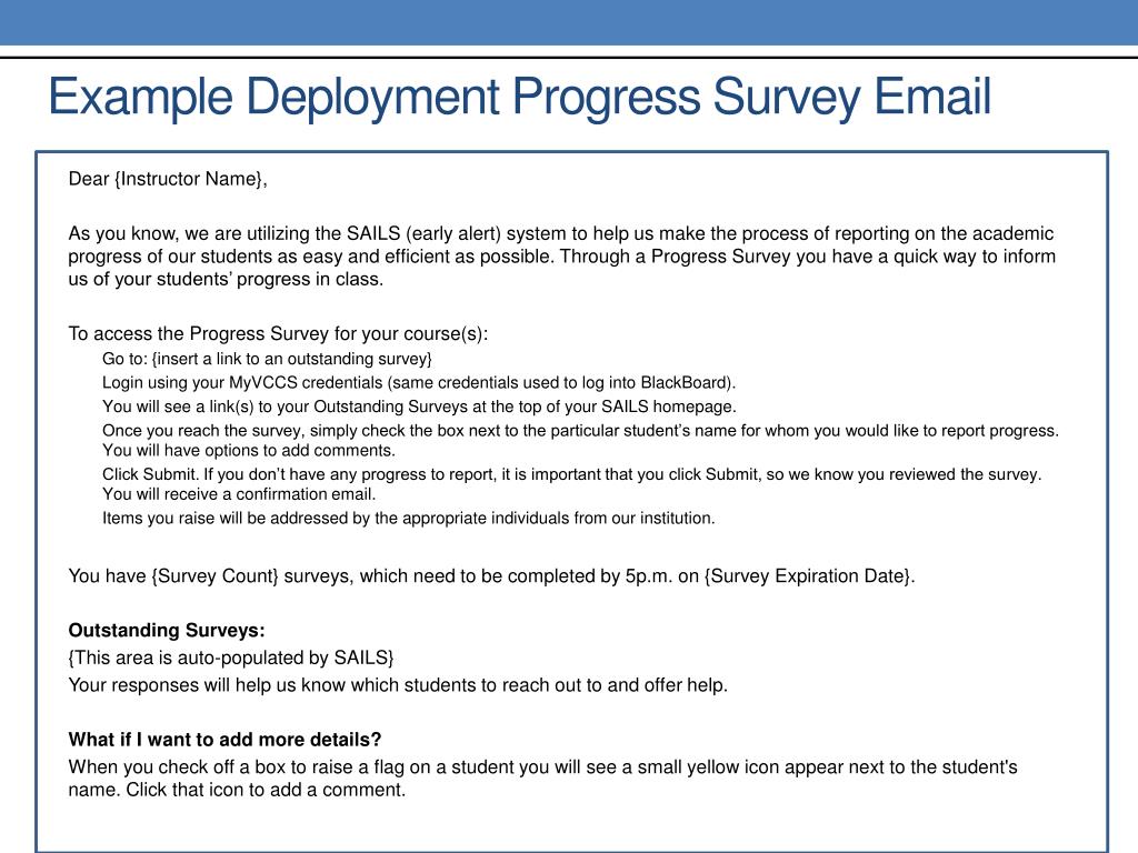 Example Deployment Progress Survey Email Dear {Instructor Name}, As you know, we are utilizing the SAILS (early alert) system to help us make the process of reporting on the academic progress of our students as easy and efficient as possible. Through a Progress Survey you have a quick way to inform us of your students’ progress in class. To access the Progress Survey for your course(s): Go to: {insert a link to an outstanding survey} Login using your MyVCCS credentials (same credentials used to log into BlackBoard). You will see a link(s) to your Outstanding Surveys at the top of your SAILS homepage. Once you reach the survey, simply check the box next to the particular student’s name for whom you would like to report progress. You will have options to add comments. Click Submit. If you don’t have any progress to report, it is important that you click Submit, so we know you reviewed the survey. You will receive a confirmation email. Items you raise will be addressed by the appropriate individuals from our institution. You have {Survey Count} surveys, which need to be completed by 5p.m. on {Survey Expiration Date}. Outstanding Surveys: {This area is auto-populated by SAILS} Your responses will help us know which students to reach out to and offer help. What if I want to add more details? When you check off a box to raise a flag on a student you will see a small yellow icon appear next to the student's name. Click that icon to add a comment.