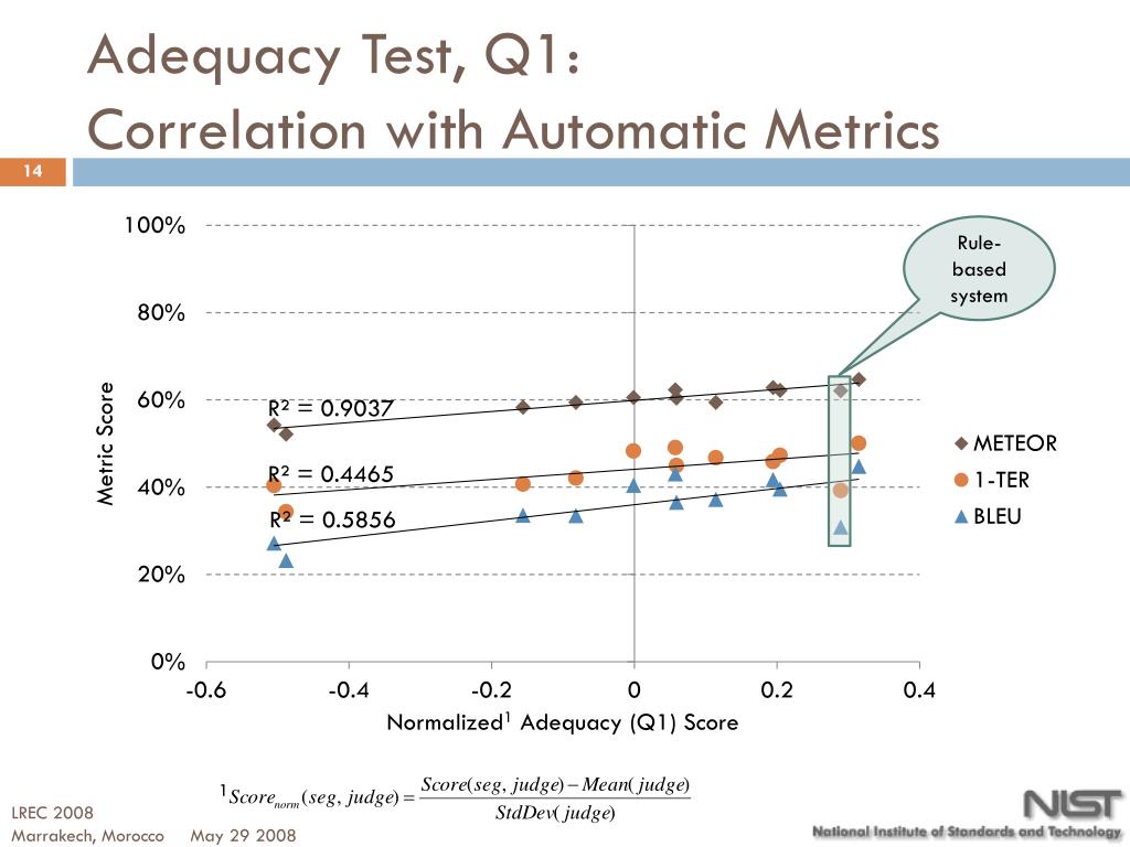 Adequacy Test, Q1: Correlation with Automatic Metrics Rule-based system 1 LREC 2008 Marrakech, Morocco