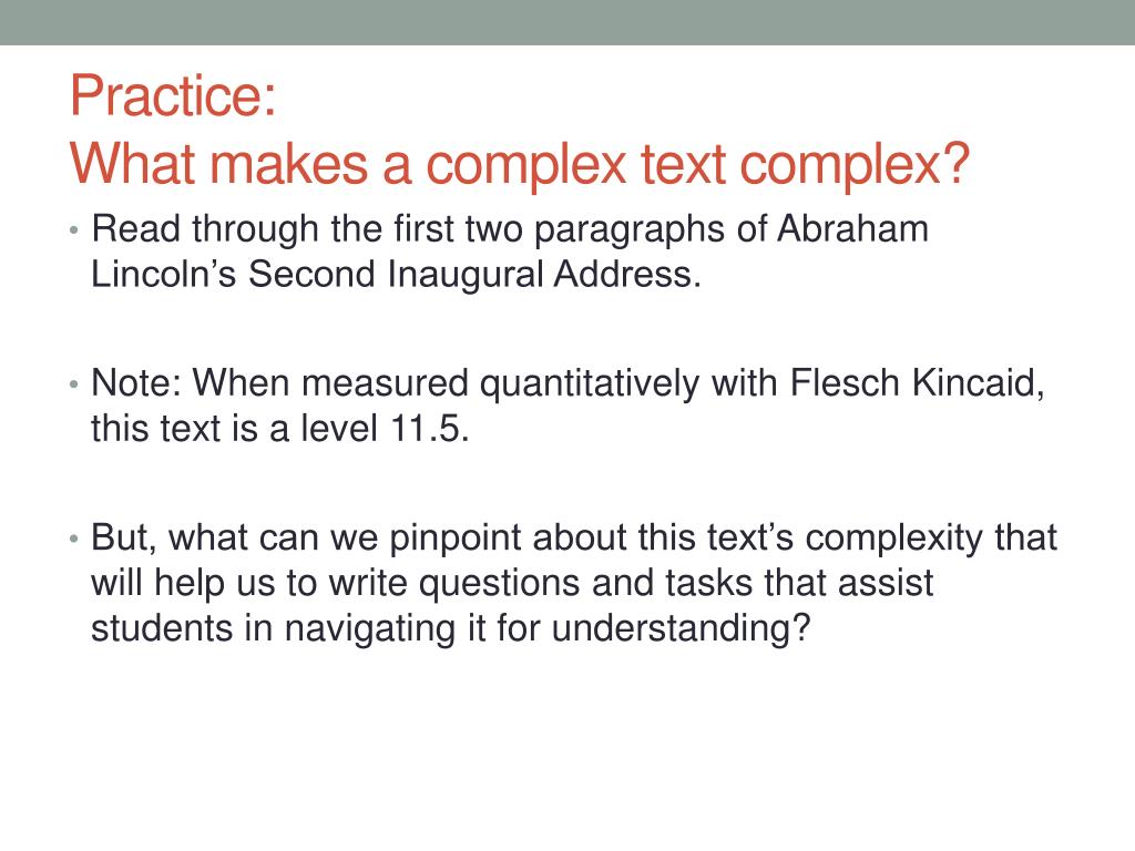 Practice: What makes a complex text complex? • Read through the first two paragraphs of Abraham Lincoln’s Second Inaugural Address. • Note: When measured quantitatively with Flesch Kincaid, this text is a level 11.5. • But, what can we pinpoint about this text’s complexity that will help us to write questions and tasks that assist students in navigating it for understanding?
