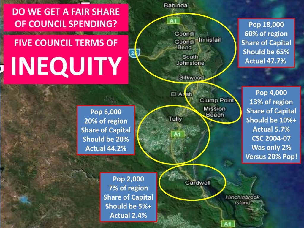 DO WE GET A FAIR SHARE OF COUNCIL SPENDING? Pop 18,000 60% of region Share of Capital Should be 65% Actual 47.7% FIVE COUNCIL TERMS OF INEQUITY Pop 4,000 13% of region Share of Capital Should be 10%+ Actual 5.7% CSC 2004-07 Was only 2% Versus 20% Pop! Pop 6,000 20% of region Share of Capital Should be 20% Actual 44.2% Pop 2,000 7% of region Share of Capital Should be 5%+ Actual 2.4%