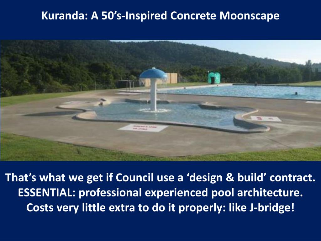 Kuranda: A 50’s-Inspired Concrete Moonscape That’s what we get if Council use a ‘design & build’ contract. ESSENTIAL: professional experienced pool architecture. Costs very little extra to do it properly: like J-bridge!