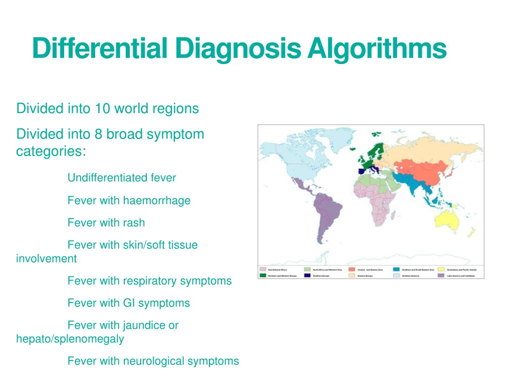 Differential Diagnosis Algorithms Divided into 10 world regions Divided into 8 broad symptom categories: Undifferentiated fever Fever with haemorrhage Fever with rash Fever with skin/soft tissue involvement Fever with respiratory symptoms Fever with GI symptoms Fever with jaundice or hepato/splenomegaly Fever with neurological symptoms