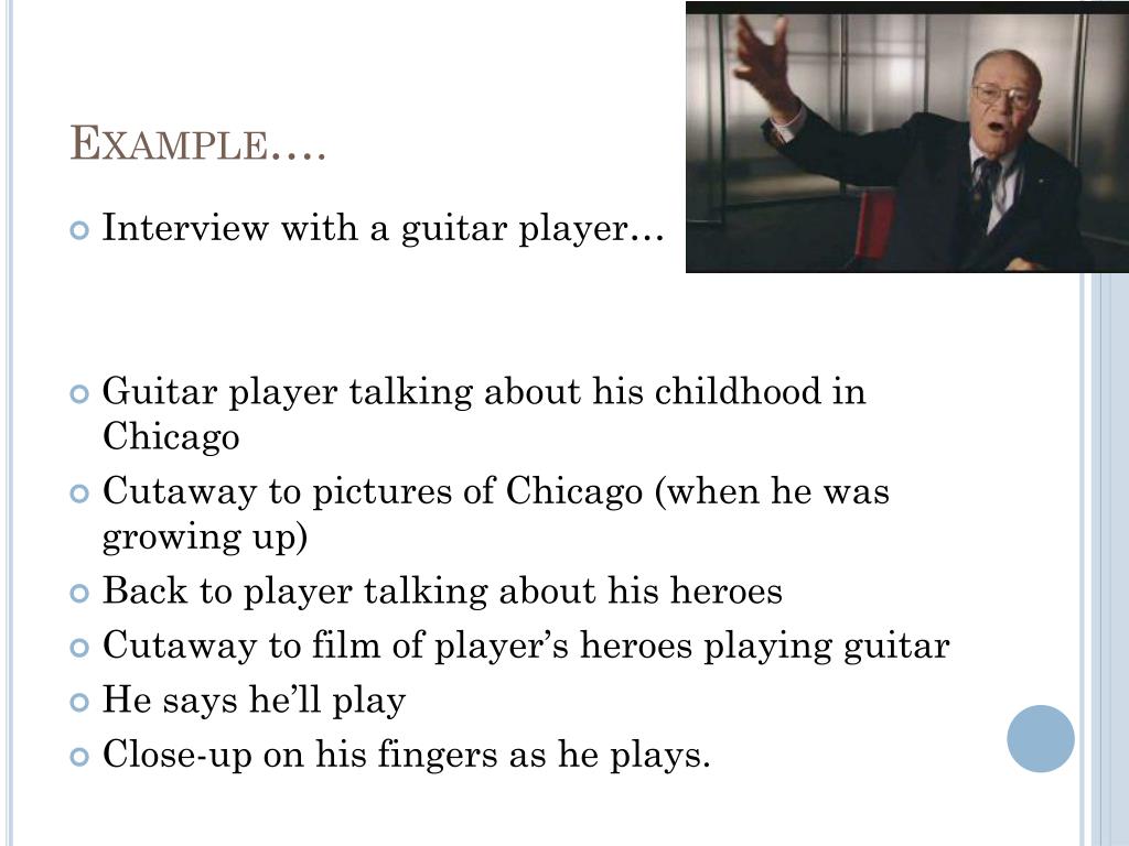Example…. • Interview with a guitar player… • Guitar player talking about his childhood in Chicago • Cutaway to pictures of Chicago (when he was growing up) • Back to player talking about his heroes • Cutaway to film of player’s heroes playing guitar • He says he’ll play • Close-up on his fingers as he plays.