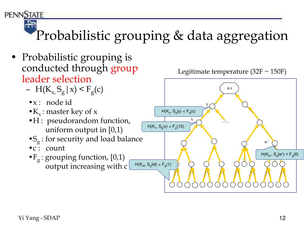 Probabilistic grouping & data aggregation • Probabilistic grouping is conducted through group leader selection • H(Kx, Sg|x) < Fg(c) Legitimate temperature (32F ~ 150F) • x : node id • Kx : master key of x • H : pseudorandom function, • uniform output in [0,1) • Sg : for security and load balance • c : count • Fg : grouping function, [0,1) • output increasing with c H(Ky, Sg|y) < Fg(c) H(Kx, Sg|x) < Fg(15) H(Kw’, Sg|w’) < Fg(8) H(Kid, Sg|id) > Fg(1) Yi Yang - SDAP