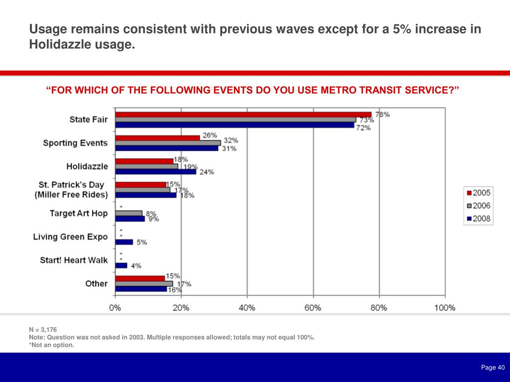 Usage remains consistent with previous waves except for a 5% increase in Holidazzle usage. “FOR WHICH OF THE FOLLOWING EVENTS DO YOU USE METRO TRANSIT SERVICE?” N = 3,176 Note: Question was not asked in 2003. Multiple responses allowed; totals may not equal 100%. *Not an option.