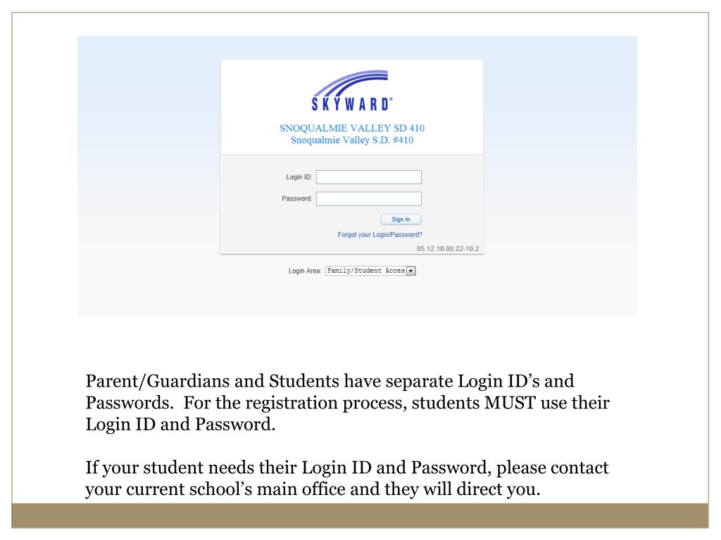 Parent/Guardians and Students have separate Login ID’s and Passwords. For the registration process, students MUST use their Login ID and Password. If your student needs their Login ID and Password, please contact your current school’s main office and they will direct you.