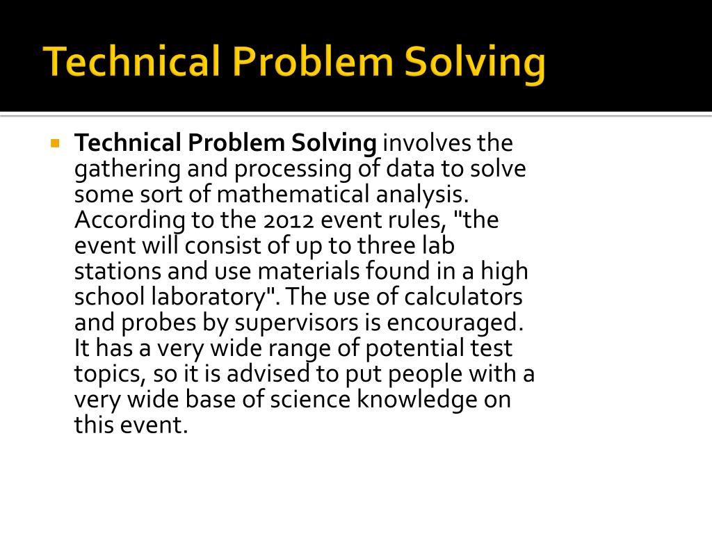 Technical Problem Solving • Technical Problem Solving involves the gathering and processing of data to solve some sort of mathematical analysis. According to the 2012 event rules, "the event will consist of up to three lab stations and use materials found in a high school laboratory". The use of calculators and probes by supervisors is encouraged. It has a very wide range of potential test topics, so it is advised to put people with a very wide base of science knowledge on this event.
