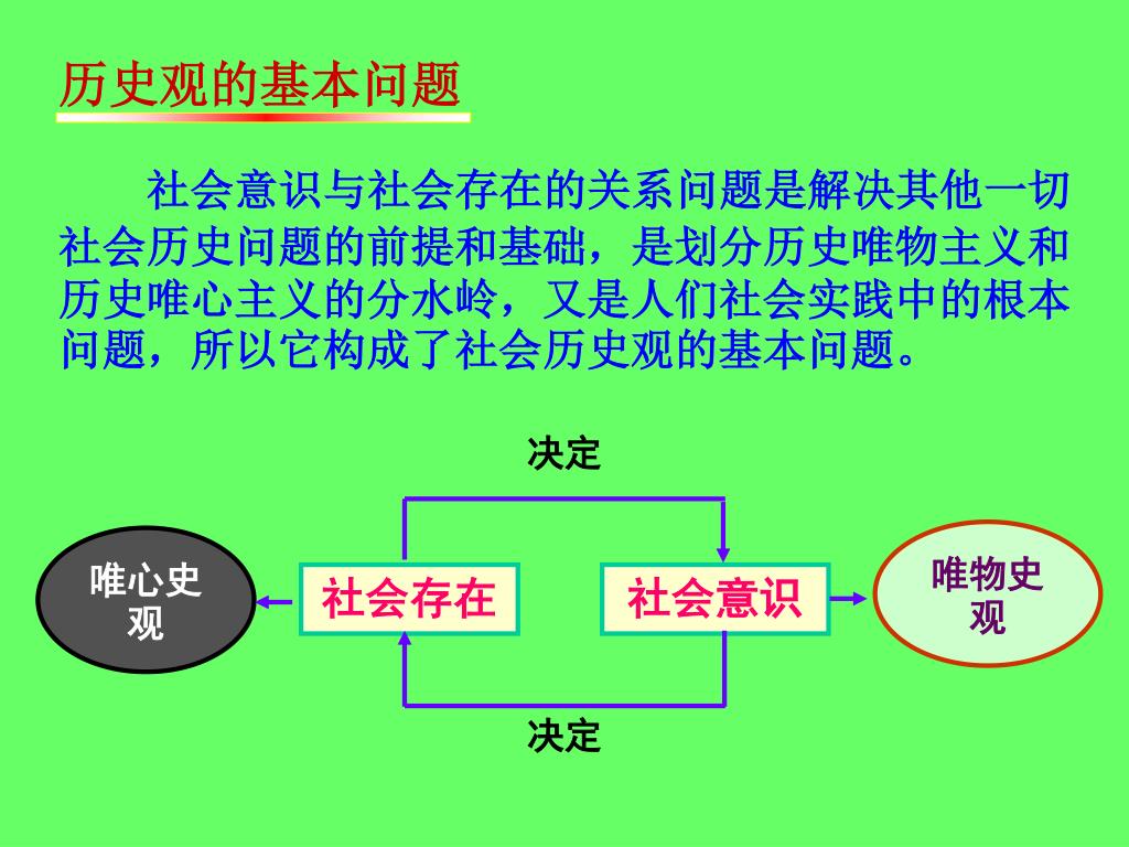 历史观的基本问题 社会意识与社会存在的关系问题是解决其他一切社会历史问题的前提和基础,是划分历史唯物主义和历史唯心主义的分水岭,又是人们社会实践中的根本问题,所以它构成了社会历史观的基本问题。 决定 唯物史观 唯心史观 社会存在 社会意识 决定