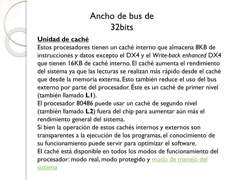 Ancho de bus de 32bits Unidad de caché Estos procesadores tienen un caché interno que almacena 8KB de instrucciones y datos excepto el DX4 y el Write-back enhanced DX4 que tienen 16KB de caché interno. El caché aumenta el rendimiento del sistema ya que las lecturas se realizan más rápido desde el caché que desde la memoria externa. Esto también reduce el uso del bus externo por parte del procesador. Éste es un caché de primer nivel (también llamado L1). El procesador 80486 puede usar un caché de segundo nivel (también llamado L2) fuera del chip para aumentar aún más el rendimiento general del sistema. Si bien la operación de estos cachés internos y externos son transparentes a la ejecución de los programas, el conocimiento de su funcionamiento puede servir para optimizar el software. El caché está disponible en todos los modos de funcionamiento del procesador: modo real, modo protegido y modo de manejo del sistema