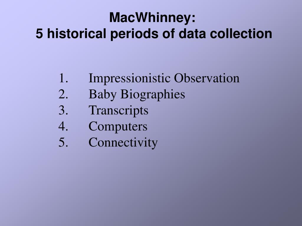 MacWhinney: 5 historical periods of data collection • Impressionistic Observation • Baby Biographies • Transcripts • Computers • Connectivity