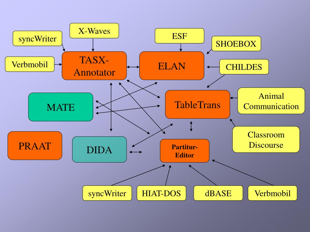 X-Waves ESF syncWriter SHOEBOX TASX EUDICO Verbmobil CHILDES Animal Communication TALKBANK MATE Classroom Discourse DIDA EXMARaLDA syncWriter HIAT-DOS dBASE Verbmobil
