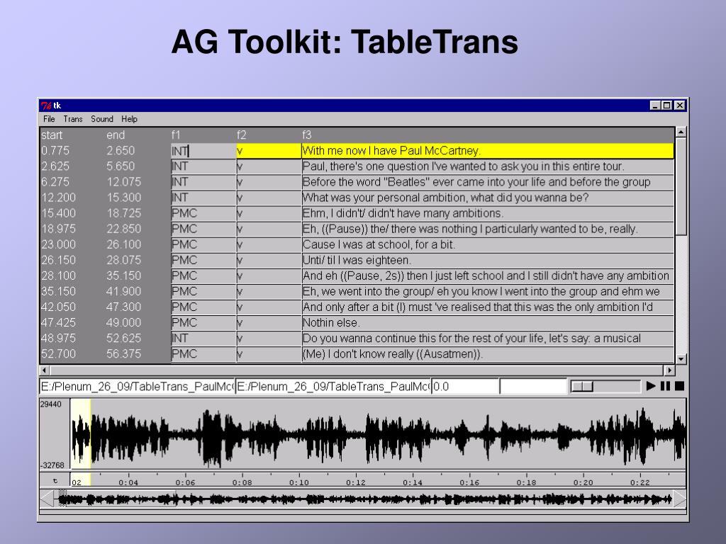 X-Waves ESF syncWriter SHOEBOX TASX- Annotator ELAN Verbmobil CHILDES Animal Communication TableTrans MATE Classroom Discourse PRAAT DIDA Partitur- Editor syncWriter HIAT-DOS dBASE Verbmobil