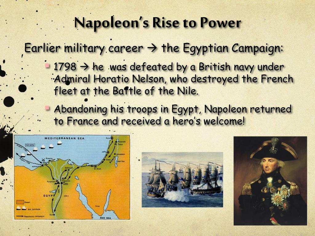 Napoleon’s Rise to Power • Earlier military career the Egyptian Campaign: • 1798 he was defeated by a British navy under Admiral Horatio Nelson, who destroyed the French fleet at the Battle of the Nile. • Abandoning his troops in Egypt, Napoleon returned to France and received a hero’s welcome!