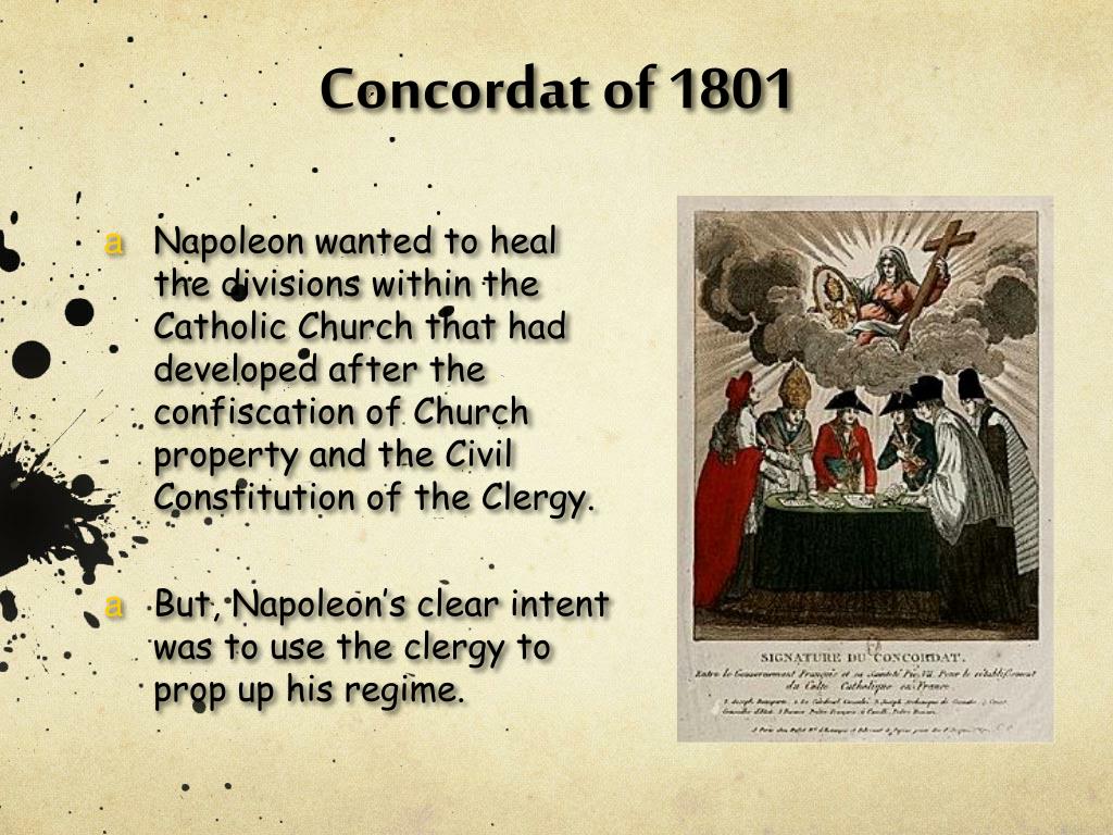 Concordat of 1801 • Napoleon wanted to heal the divisions within the Catholic Church that had developed after the confiscation of Church property and the Civil Constitution of the Clergy. • But, Napoleon’s clear intent was to use the clergy to prop up his regime.
