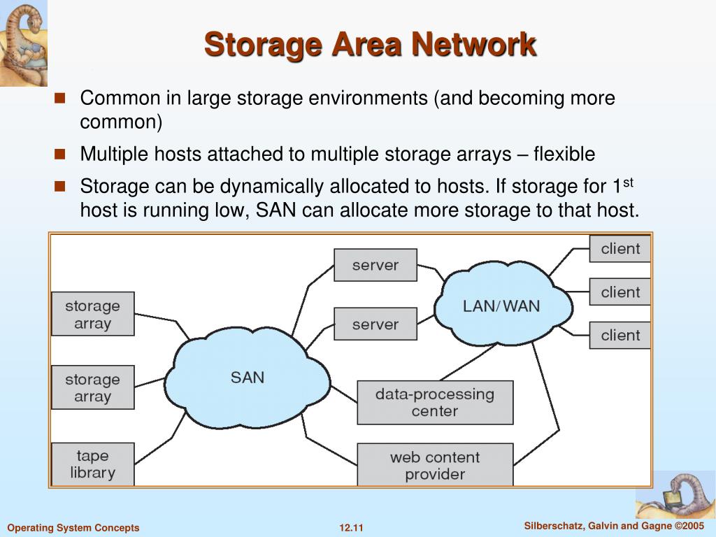 Storage Area Network • Common in large storage environments (and becoming more common) • Multiple hosts attached to multiple storage arrays – flexible • Storage can be dynamically allocated to hosts. If storage for 1st host is running low, SAN can allocate more storage to that host.