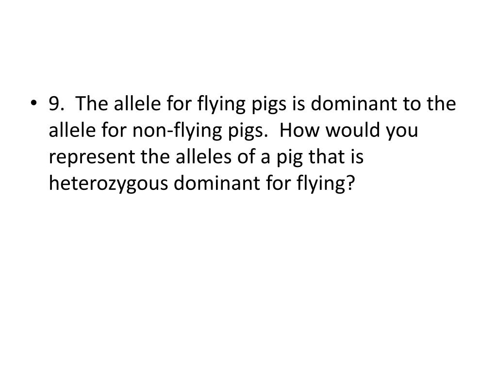 9. The allele for flying pigs is dominant to the allele for non-flying pigs. How would you represent the alleles of a pig that is heterozygous dominant for flying?