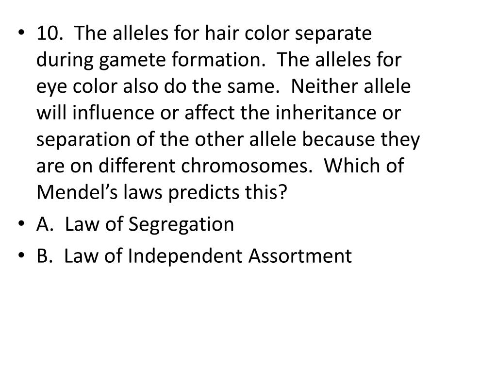 10. The alleles for hair color separate during gamete formation. The alleles for eye color also do the same. Neither allele will influence or affect the inheritance or separation of the other allele because they are on different chromosomes. Which of Mendel’s laws predicts this? • A. Law of Segregation • B. Law of Independent Assortment
