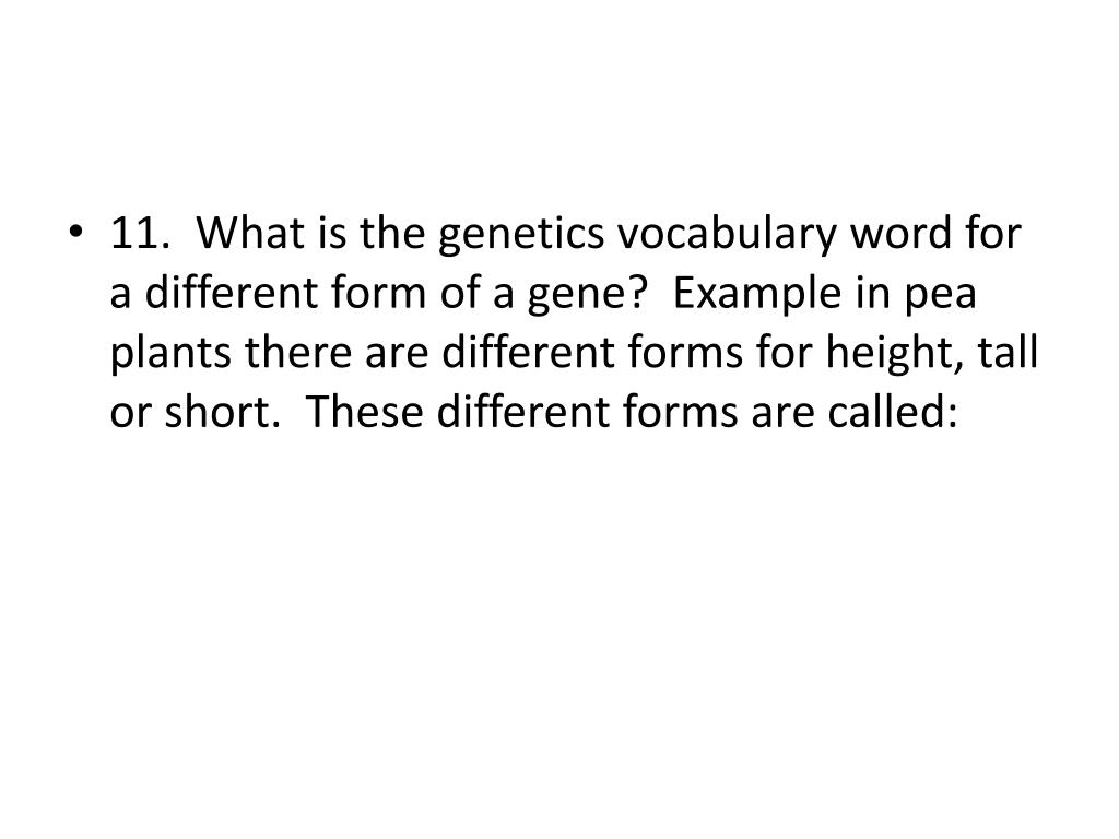 11. What is the genetics vocabulary word for a different form of a gene? Example in pea plants there are different forms for height, tall or short. These different forms are called: