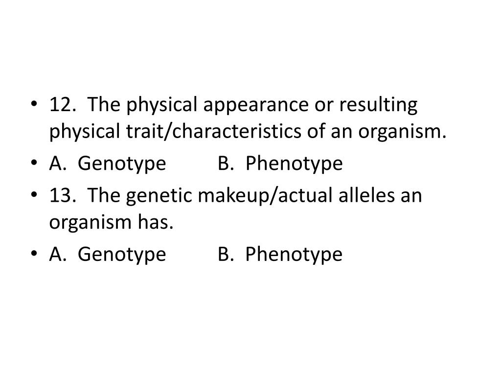 12. The physical appearance or resulting physical trait/characteristics of an organism. • A. Genotype B. Phenotype • 13. The genetic makeup/actual alleles an organism has. • A. Genotype B. Phenotype