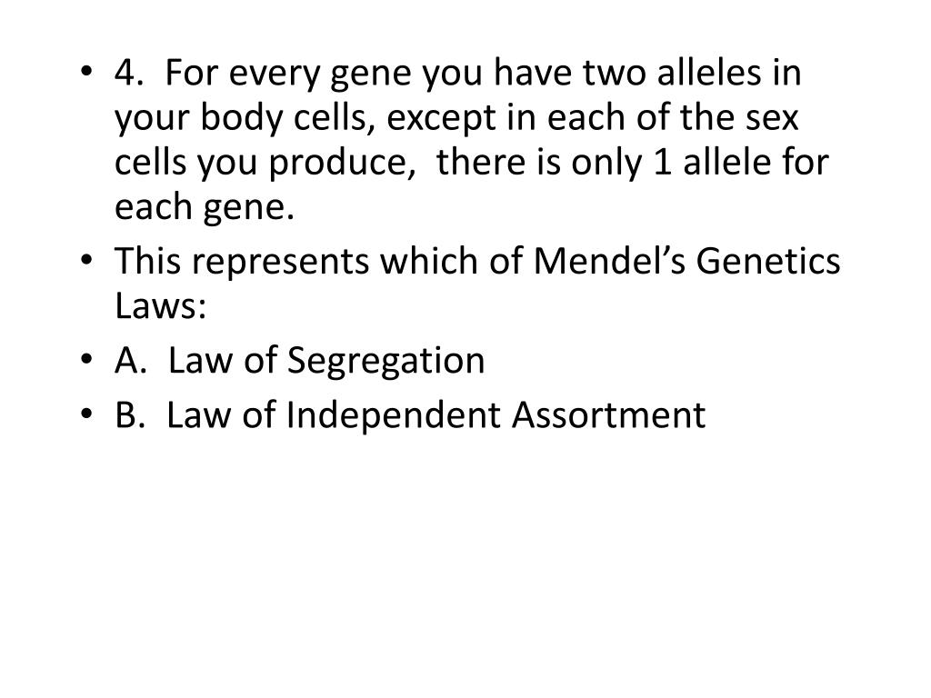 4. For every gene you have two alleles in your body cells, except in each of the sex cells you produce, there is only 1 allele for each gene. • This represents which of Mendel’s Genetics Laws: • A. Law of Segregation • B. Law of Independent Assortment
