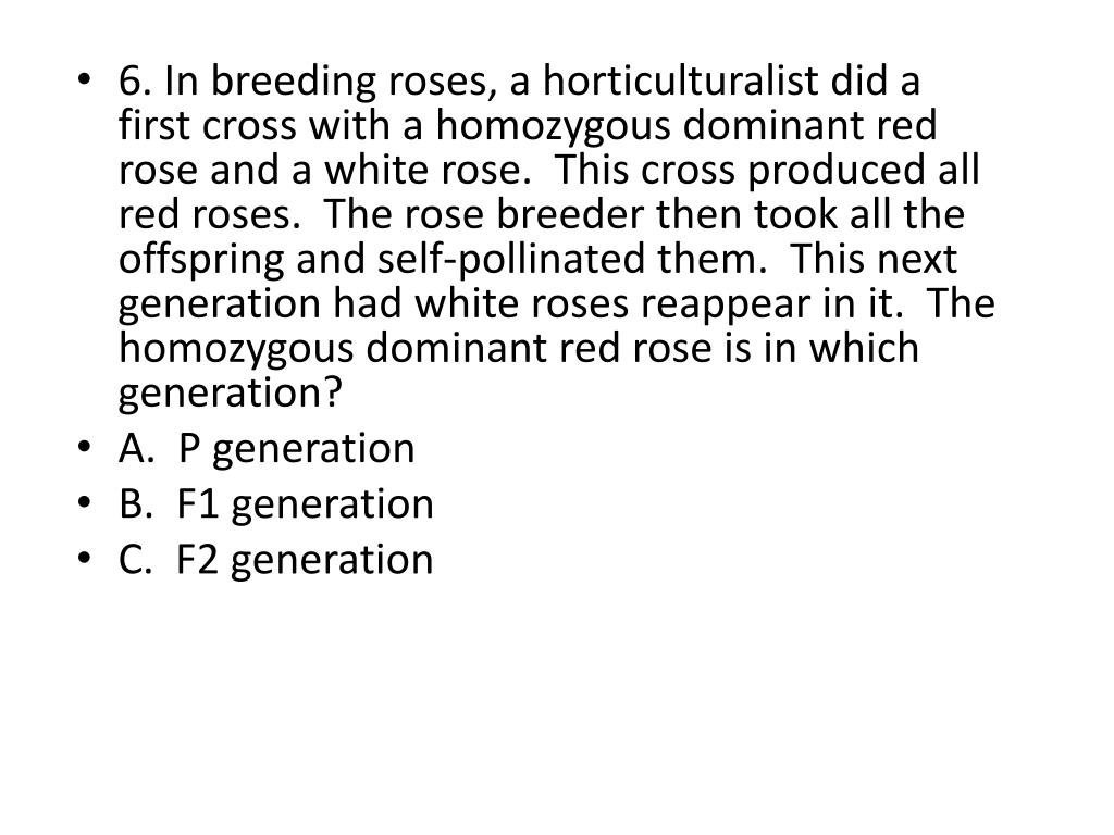 6. In breeding roses, a horticulturalist did a first cross with a homozygous dominant red rose and a white rose. This cross produced all red roses. The rose breeder then took all the offspring and self-pollinated them. This next generation had white roses reappear in it. The homozygous dominant red rose is in which generation? • A. P generation • B. F1 generation • C. F2 generation