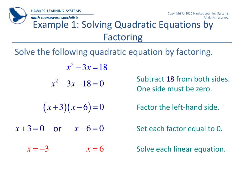 Example 1: Solving Quadratic Equations by Factoring Solve the following quadratic equation by factoring. Subtract 18 from both sides. One side must be zero. Factor the left-hand side. or Set each factor equal to 0. Solve each linear equation.