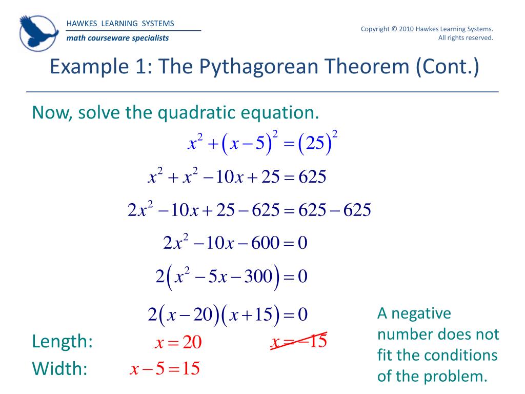 Example 1: The Pythagorean Theorem (Cont.) Now, solve the quadratic equation. A negative number does not fit the conditions of the problem. Length: Width: